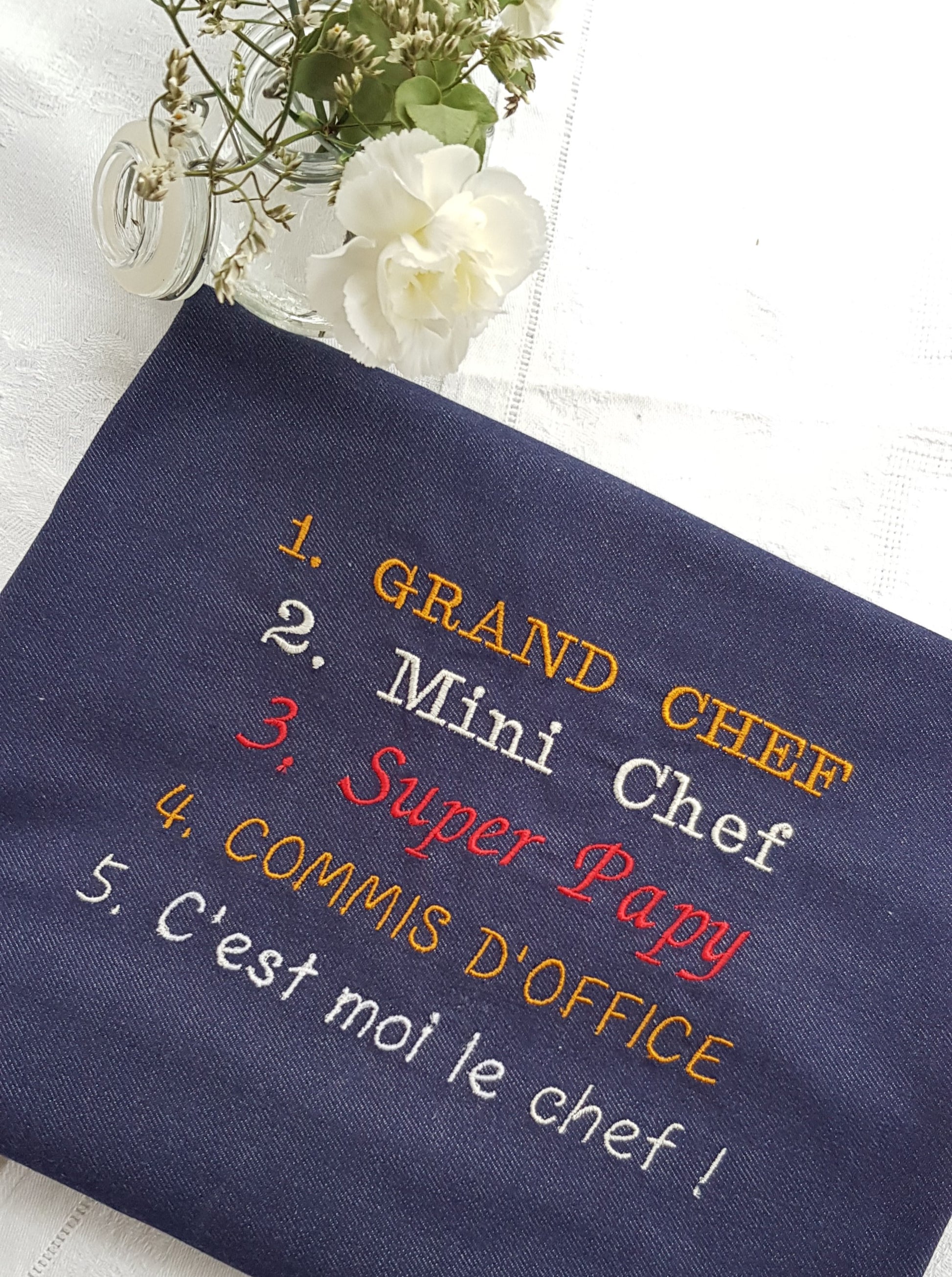 Ce tablier en toile de coton denim sera parfait pour tous les membres de la famille. Personnalisé, personne ne pourra vous le piquer !